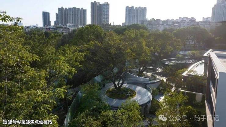 整体地块抬高约7~9米,退距约35米,形成一座隐藏在城市核心的低密浮岛,隔绝外界喧嚣。