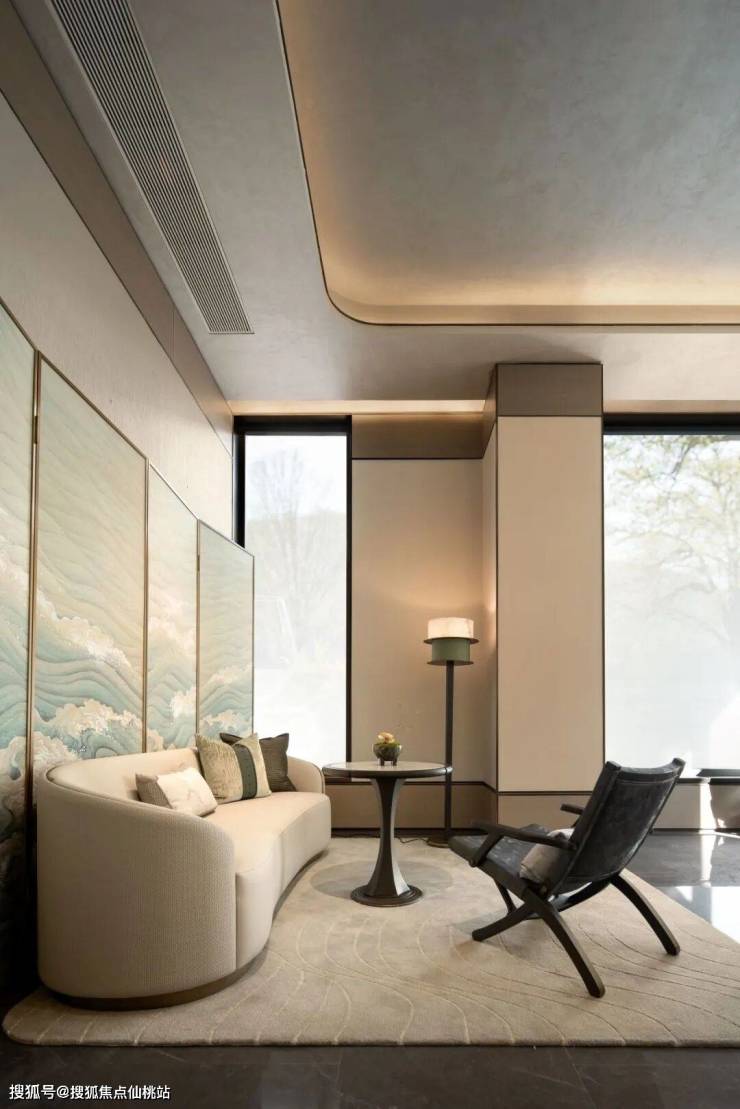 “山水剪影”艺术墙贯穿门厅与走廊,石材拼贴出宋画《溪山行旅图》的抽象变体,光影投射下,行人如游画中。电梯厅悬挂“天蓝釉刻花鹅颈瓶”复刻雕塑,裂纹釉面在射灯下泛出粼粼微光,仿佛将北宋官窑的千年气韵凝于一瞬。门厅在晨光中显得格外清晰,漫步于此,仿佛穿越千年的山水画卷。