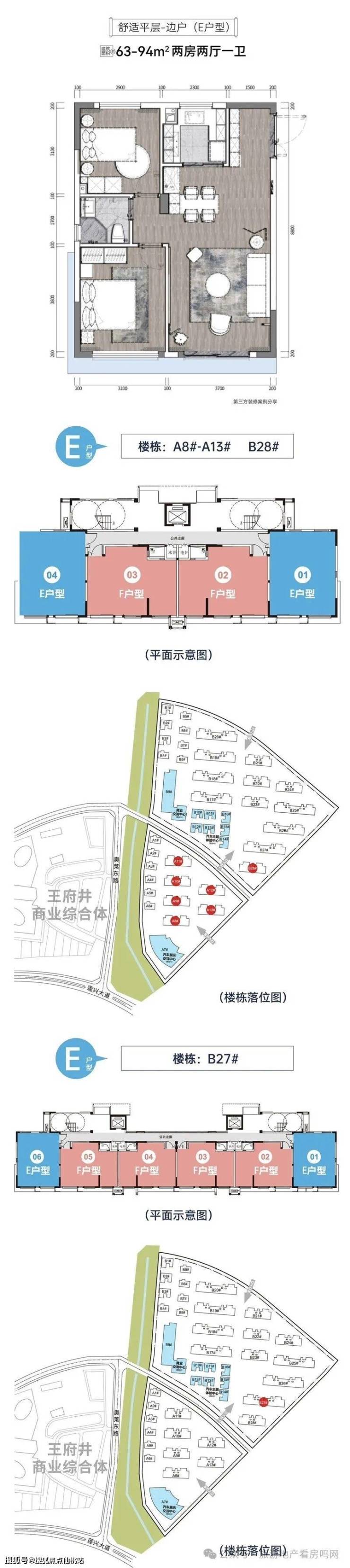 舒适平层-边户(E户型):2房2厅1卫,产权建面约63-95㎡,实得建面约86-95㎡,总高为6层,层高为3米,一楼花园面积约35-60㎡。该户型南北通透,全屋中央空调,分区布局合理,品质两房。