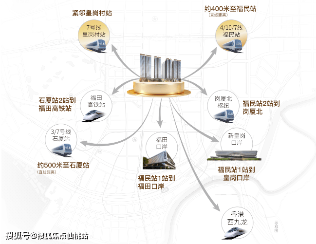 1站即达双口岸,2站速抵福田高铁站与岗厦北枢纽,双地铁口无缝衔接四条地铁线——