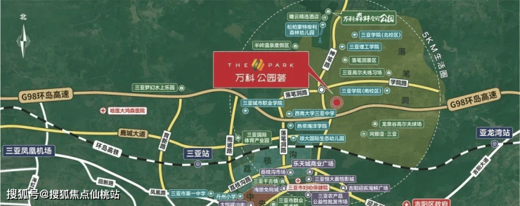 万科·公园荟占据三亚文旅横轴中点,依托环岛高速公路、学院路、迎宾路等内通外联立体交通体系,快速串联三亚湾、大东海、亚龙湾、凤凰机场等城市热点区域,实现约5km辐射范围内,一轴揽四湾。
