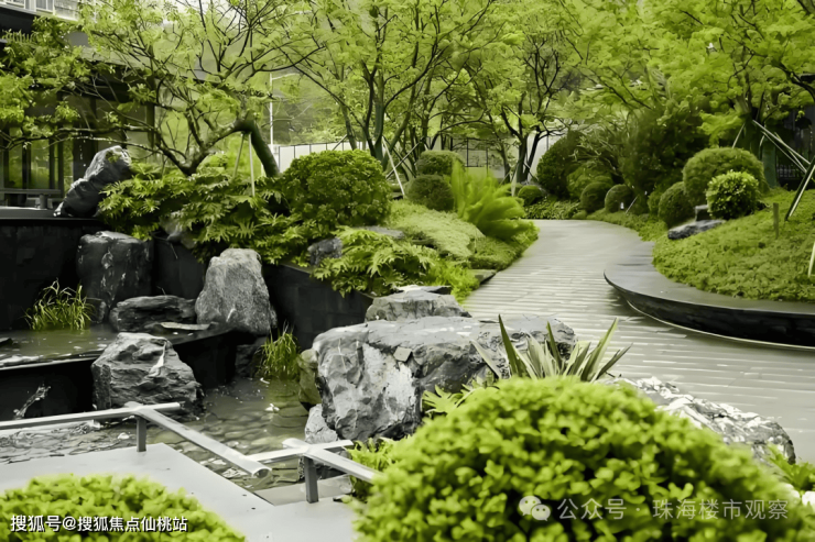 小区园林采用新宋式风格园林设计,有小桥、流水、瀑布等元素,绿化率35%,营造森林漫步的感觉