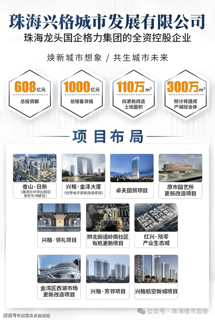 项目开发商:珠海兴格城市发展有限公司;成立于2021年1月,是格力集团全资控股的国有成员企业。公司专注于城市更新领域,以“产业引领,城市焕新”为发展理念,致力于通过旧城镇、旧村庄、旧厂房等全面改造及微改造项目激活土地存量,改善人居环境。截至2021年10月,公司储备土地面积逾65万方,总货值达1000亿元