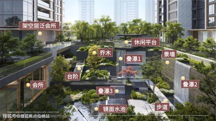 我看见了——架空层的泛会所,站在这里,可以俯瞰整个庭院景色;休闲平台,犹如悬浮在庭院之上,增加庭院立体感;三层叠瀑,不同高差,让空间动起来;镜面水池,打破呆板,黑色的池底,更添一份质感;景墙,借助石材质感形成空间的停顿节点,强化意境与记忆点;乔木,制造视线停留,空间更加有层次;廊桥、台阶、步道经纬交错,多重游览动线,路径不单调,沉浸式体验感更强。