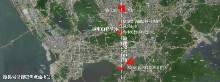 ④深圳发展中轴,华南数字超级总部基地、星河world总部基地、坂雪岗科技城、北站产融结合示范区、梅彩新一代信息科技,连成深圳中轴含金量置顶的价值金线。