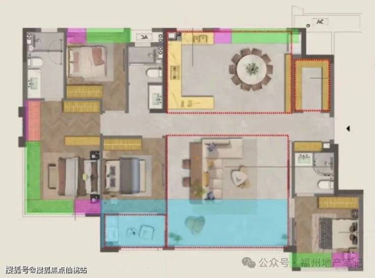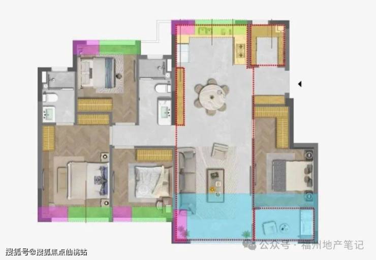 四房两卫,洋房常见的三面宽类四叶草户型,一样的存在动线问题;玄关不独立做鞋柜,但多了储物间功能。
