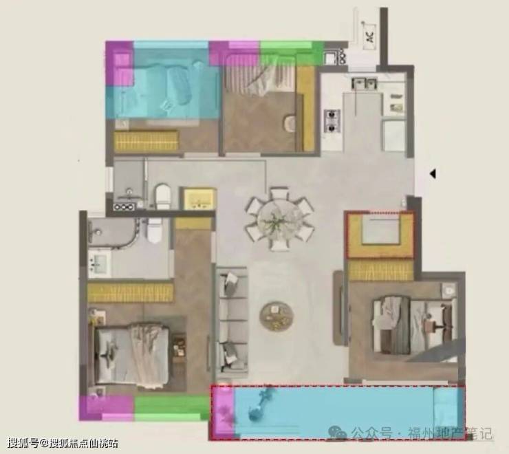 小缺点是次主卧的设计上,卧室门破坏了客厅电视墙。