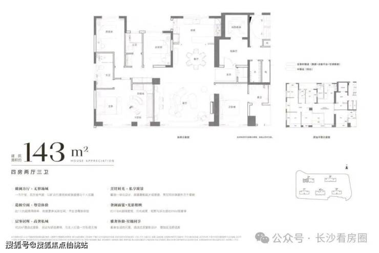 143㎡户型(原139㎡升级):得房率从114.8%提升至121.3%,套内面积达173.4㎡。北向可拓展为大阳台+晾晒区,南向进一步扩大套卫面积,成为项目最大赢家。