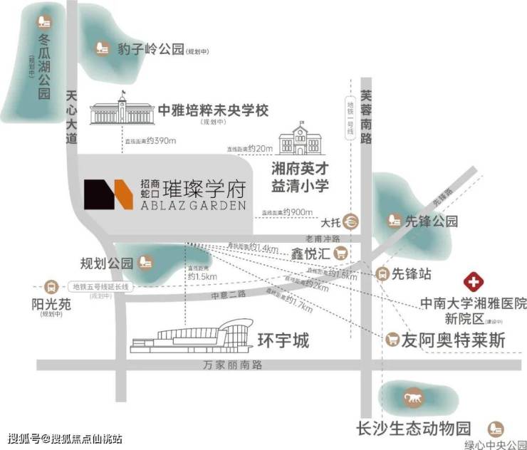 天心的整体建设,沿着天心大道(自天心中心-新开铺板块-黑石铺板块-解放垸板块)高速向南发展。而璀璨学府项目地处天心向南的关键枢纽处,北邻省府、西邻黑石铺及解放垸、南临中信商圈、东临红星,距离奥体中心(规划中)直线距离仅约3公里,享受成熟板块配套利好以及规划板块的未来红利