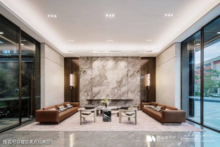 1.出入归家礼待:东入口社区大堂面积约120㎡,层高约5.5米(装修后约4.7米),墙面为瓷砖通铺,地面为石材微缝拼接,右侧通过大面岩板+天然云石壁灯渲染酒店式归家氛围;楼栋入户大堂采取电动对开门设计,层高约3.6米(装修后约3.1米),悬浮吊顶,墙面及地面通铺“简一(900*1800)”瓷砖,充分运用光影变化、艺术点缀、高贵建材等手法强化了精致的空间美学,匠著更契合业主的学府生活方式