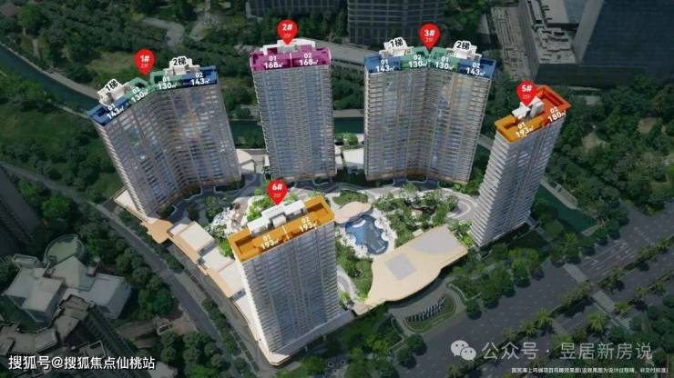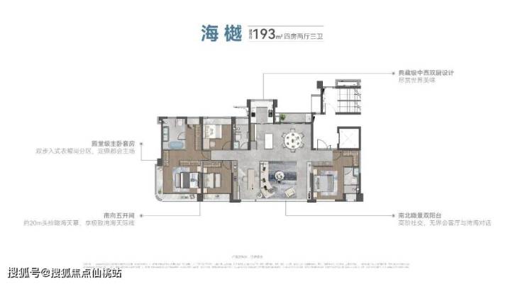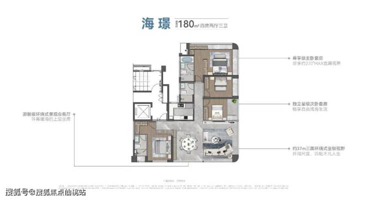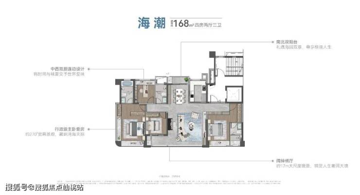 建筑面积约168㎡则超越大部分同级户型,实现了主卧双面瞰景、超72m中庭视距和74m瞰海景观面的三重优势。