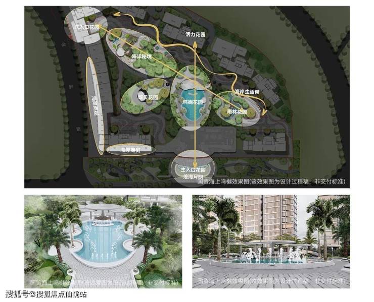 取法国际奢享度假酒店规划灵感, 匠心打造海月森屿滨海度假式庄园, 超6000m中庭园林+ 双轴一心一带多花园+ 贸贸岛儿童游乐区+中轴戏水区等,奠定了度假式生活底色的“高级感”。