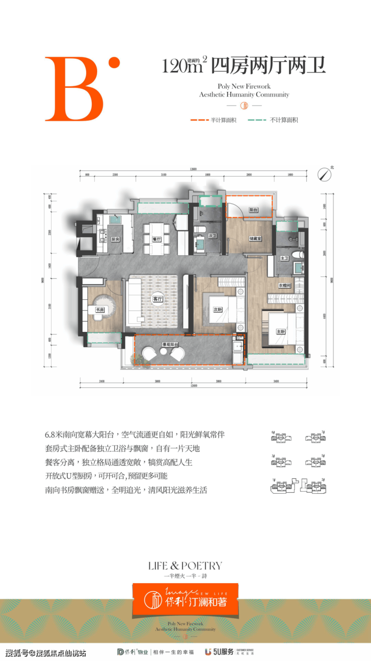 依托巧妙设计,项目平均得房率超过87.6%。以建面约120㎡户型为例,项目可以做到4房,而且是正规格局,舒适度很高,但市面上同类产品只有3房。