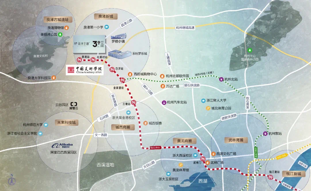 项目位于古墩路与杜文路交叉口,地铁2号线良渚站地铁上盖项目,属于良渚新城板块。良渚新城东靠京杭大运河,南边面朝拱墅、西湖区,西边背靠仓前、瓶窑,北边则是德清,区域内人口达到40多万人。纵观整个余杭区,良渚新城因其重要的地理位置,成为了城北副城的新中心。