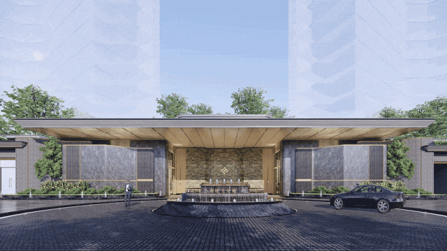 社区入口处,挺拔的灿金门头、以典雅黑灰奢石点缀墙面、再配以酒店式环岛落客区,唯美璀璨水景,奢华且极具辨识度。