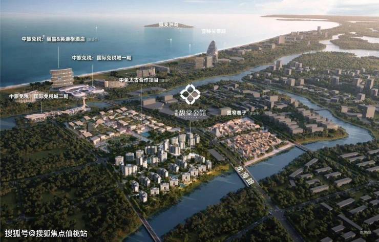项目位于三亚市海棠湾黄金地段北端,与亚龙湾和清水湾相连。项目位于中旅免税城西北侧。用地周边有河道及景观绿化带。