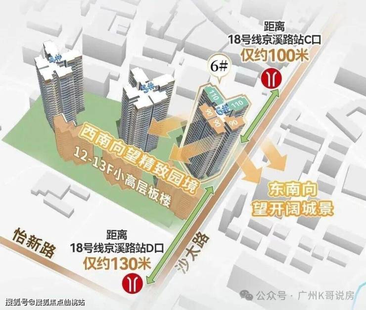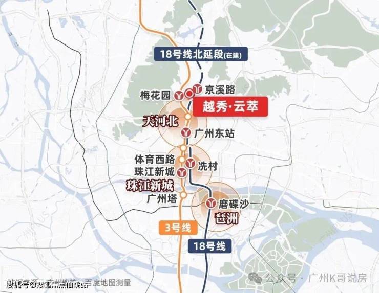 云悦二期算是一个双地铁项目。一来,家门口就是18号线京溪路站。未来业主,下楼乘坐18号线,就能一线直达琶洲(磨碟沙站)、珠江新城(冼村站)、天河北(广州东站),万博(南村万博站),根本不需要换乘。而步行约800-900米,就能到达3号线梅花园站。同样,乘坐地铁无需换乘,便能抵达体育西路、珠江新城。