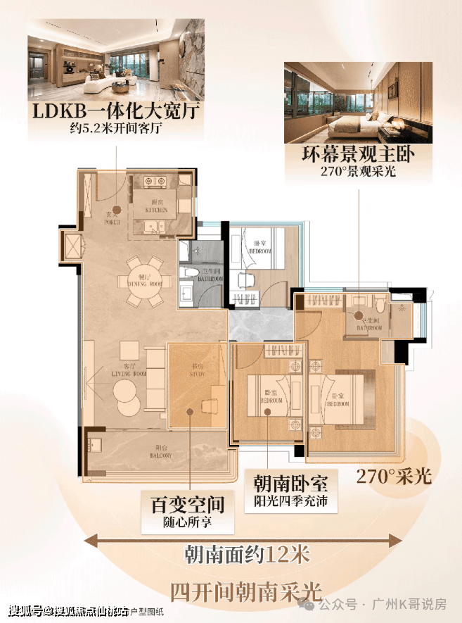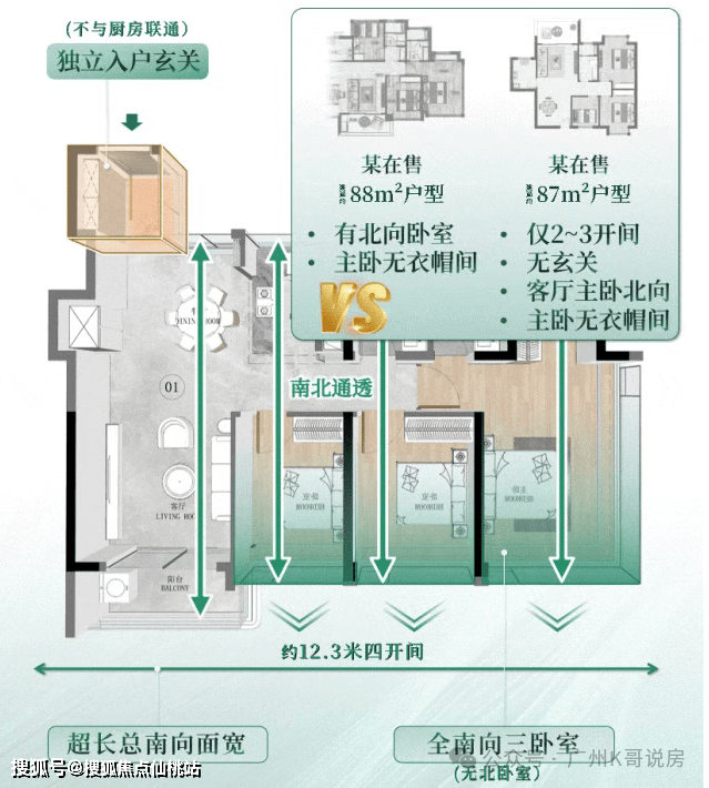 约12.3米总南向面宽,客厅和卧室均为南向布局