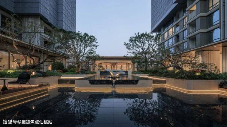 第二进庭院位于榕树广场与大树书吧之间,庭院通过水景与绿植的结合,为艺术柱廊营造出静谧的氛围。中央水池的反射与两侧灯光路径相呼应,增强了空间层次感与引导性,提供了一个既安静又具流动感的休憩空间。