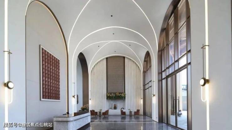 走进大堂,浅色瓷砖墙面、岩板端景墙等质感元素随处可见,精致细节,让归家也是一场体面的礼遇。