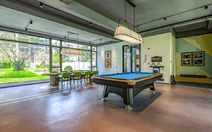 步入高阔的入户大堂,一扇中式屏风如展开的山水手卷横亘眼前,山峦起伏连绵而上。两侧廊柱上悬着宫灯,暖黄的光在地面投下细密的光斑。微风拂过,灯影与屏风上的格栅纹轻轻摇曳,仿佛将千年的月色也揉碎在这方寸之间,归家的步履便不自觉缓了下来。
