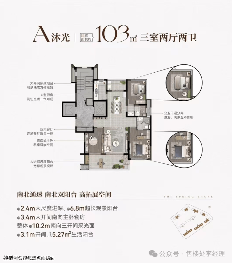 这个户型收纳洗衣便捷高效,设有大开间家政阳台。厨房洗切烹煮一气呵成,公卫干湿分离,互不影响。客厅与餐厅连通,空间开阔。套房式主卧,搭配大进深尺度阳台,拥有宽幕观景视野。南北通透,南北双阳台设计,拓展空间大。南向主卧套房开间 3.4m,还有 2.4m 大尺度进深、6.8m 超长观景阳台,整体 10.2m 南向三开间采光面,阳光满满。