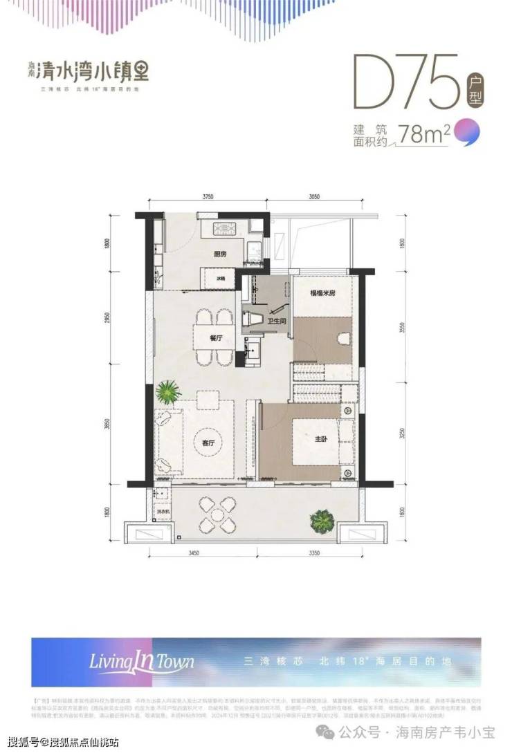 ①两房 D75 面积约78㎡,阳台面积约10㎡;