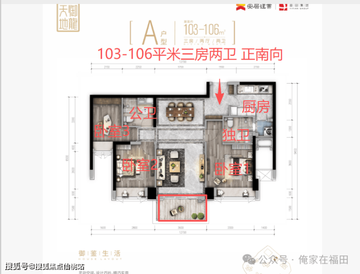 【户型解析103-106平米三房两卫 双龙抱珠户型】客厅朝正南向 客厅带阳台 采光很好 看别墅片区 采光视野都很好