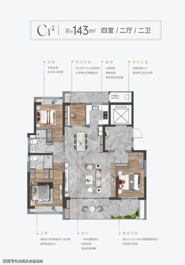 • 143㎡四房:专梯入户,5.6米IMAX客厅+8.6米巨幅阳台,三代同堂首选。