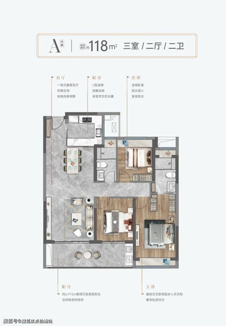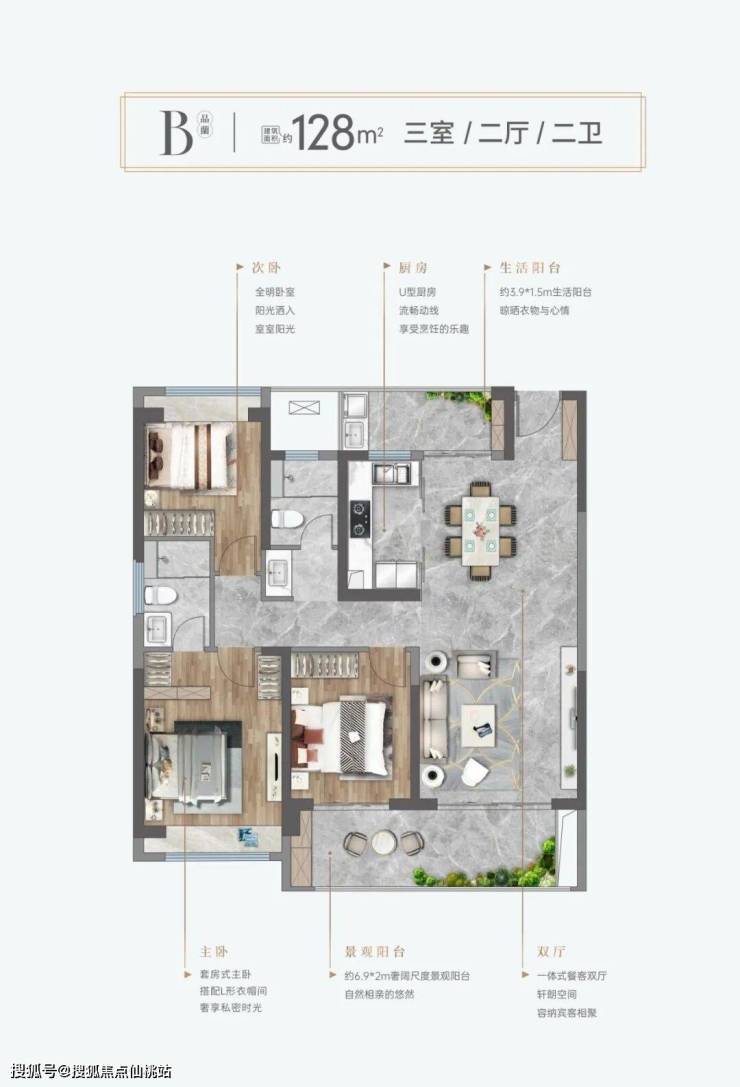• 128㎡三房:6.9米景观阳台,南北通透,主卧套房+步入式衣帽间。