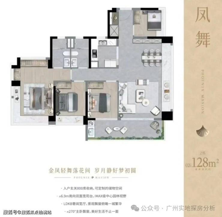 约128㎡四房两厅两卫,南向四开间,约7.5米双面宽阳台,约100%使用率。