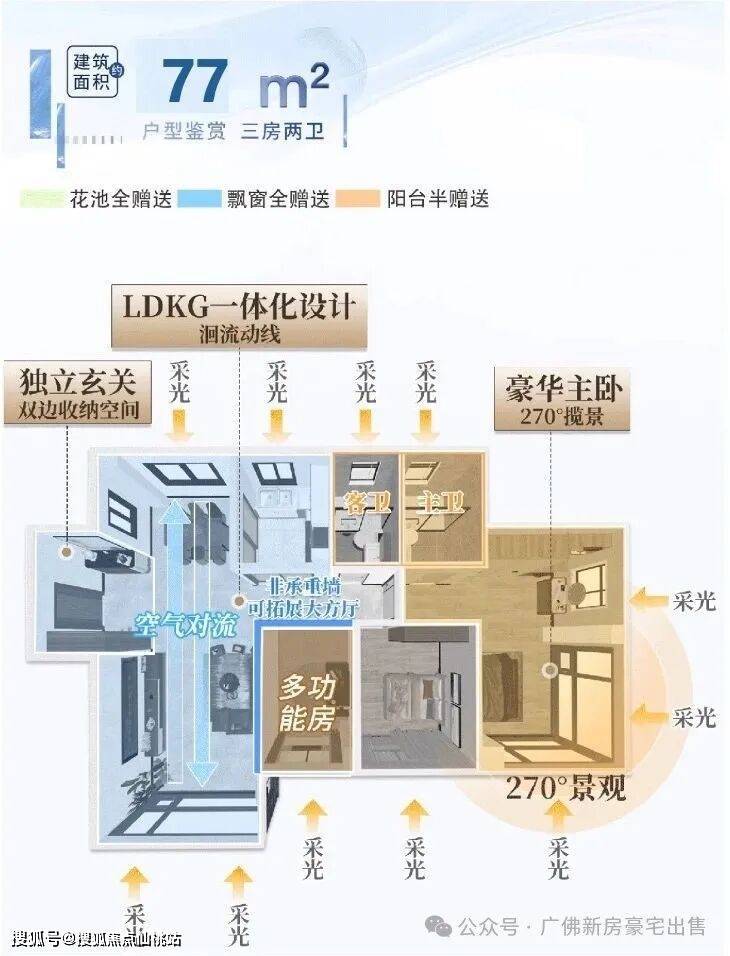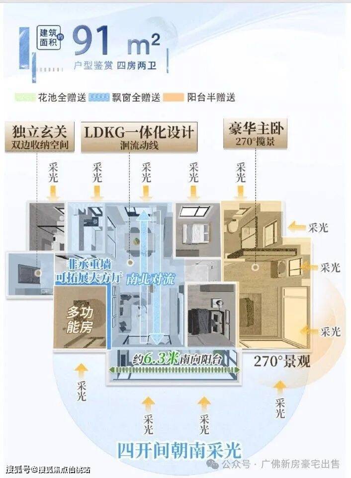新规产品,广州首创“零飘窗”产品,将空间发挥极致,建面约77-91㎡三四房,全双卫设计,打造南北通透低密精奢小户,真正做到高赠送高使用