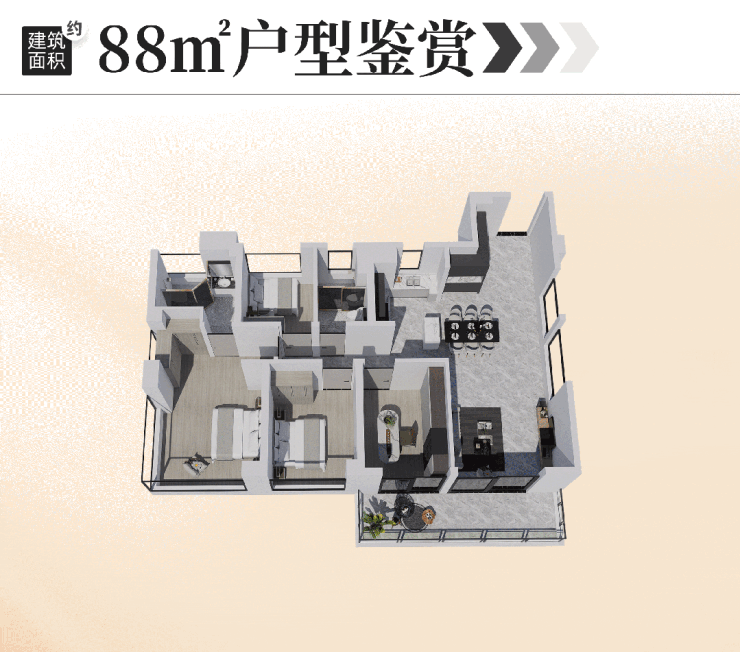 88平四房,做到四房,实现了四空间两卫双开配景观阳台;