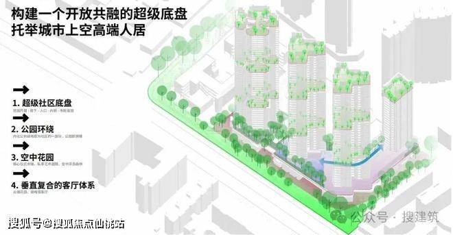 针对地块用地集约、需求多元的特性,设计摒弃传统平面布局思维,构建“立体底盘 + 空中休憩场域 + 人居空间”的三维空间体系。通过空间的垂直分区规划,实现公共场景与私密领域的有序衔接,地面层强化公共开放属性与城市配套的融合,上层空间营造静谧舒适的居住氛围,达成“城市烟火与私密生活”的和谐共生,让每一层级空间都承载独特的人居价值。