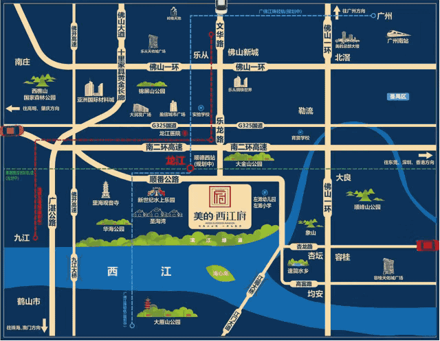 美的西江府,雄踞龙江中心黄金腹地,坐拥广佛利好,毗邻城市顶级商业中心——盈信广场、大润发商圈,扼守城市交通动脉顺番公路、乐龙路,出行便利,全城畅行无阻!