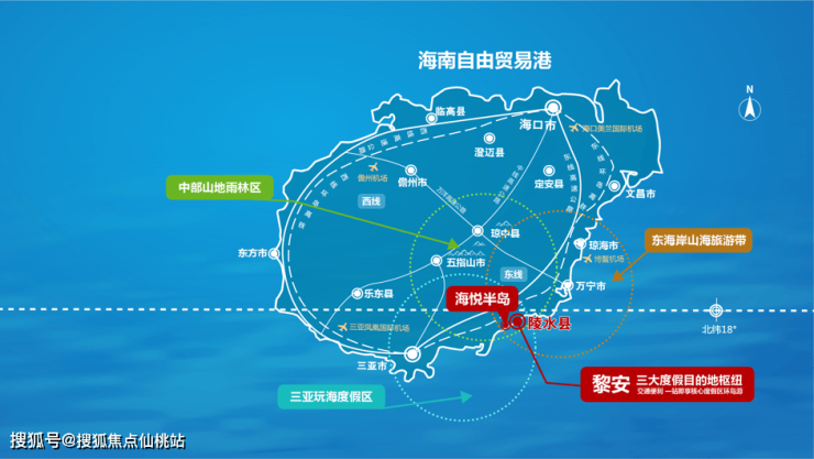 海悦半岛位于北纬18°以南,处于三亚滨海度假区与中部山地雨林区、东南海岸山海旅游度假区交汇区域,进可热带山海,退可一城繁华。于此,开启伴城伴山伴海的美好假期。