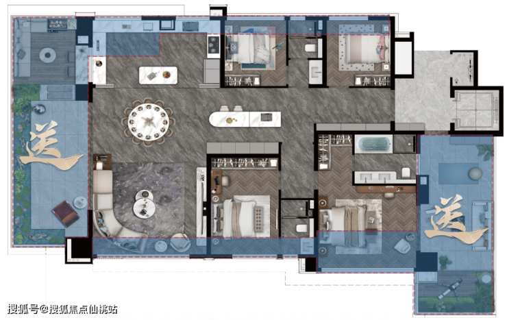 更重要的一点,建发灏云打破四代宅室内空间逼仄的痛点,将阳台外扩,飘窗内包,平衡室内与露台空间,还提升了室内采光。且项目凭借四代宅露台全赠送的规划红利,230㎡的户型可达到300㎡的尺度。