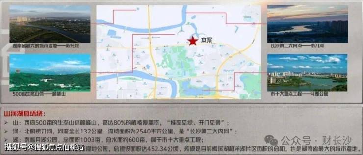 北靠捞刀河风光带、南临长沙大学及1003亩的月湖公园、西倚500亩生态山体麓峰山,依山傍水,独享生态谧境,城市级私享山河湖园景观,繁华都市里的静谧”桃花源“。