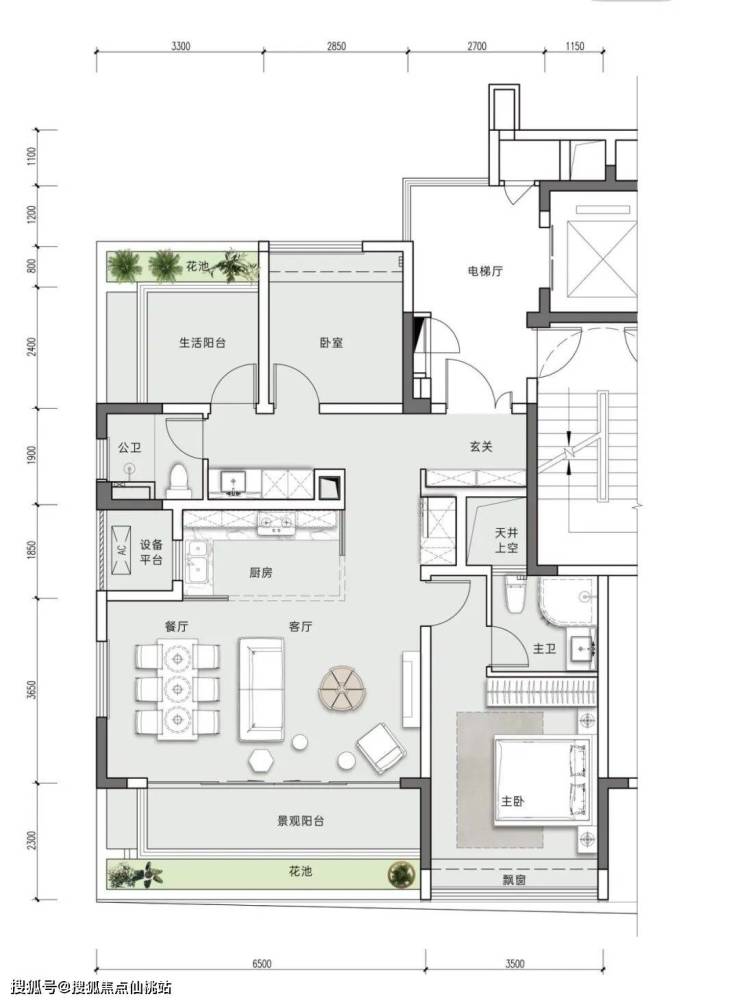 8.得房率:私家电梯厅私密独享,户内超高赠送,户户近100%得房率。