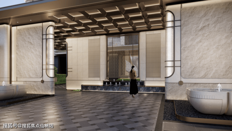 社区多处运用石材拼色设计,上百块图案都需独立切割,其纹理转译自江水涨动,既隐喻江景地位,又与高奢风格相契合。