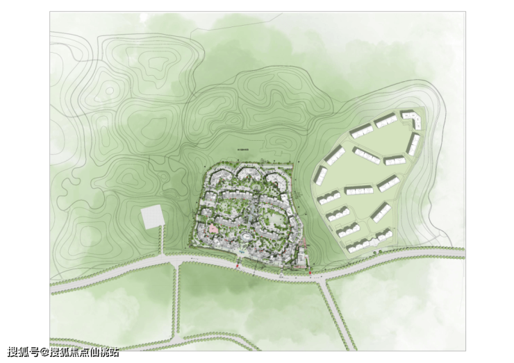 -市政入口到达区为草甸,通过入口及市政绿化带起伏的地形和草甸体现。