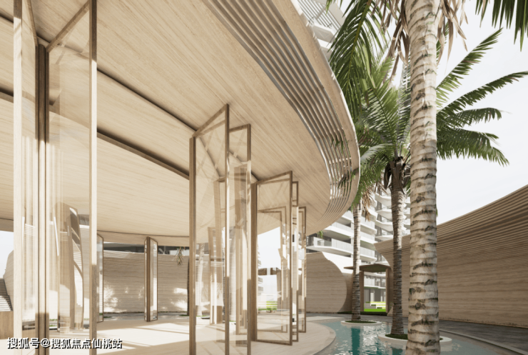 建筑立面整体呈现代简洁风格,结合海岸风情、海水湿地环绕的环境特质,以更加生动的形式去营造和谐与整体的比例,强调地域化的特征。设计提出松弛度假的主题,通过变化的水平线条表达横向舒展的意向,勾出动态、生动且有生命力的建筑形象。同时在近人尺度上增加建筑的丰富性。在建筑材料上,底部基座局部采用石材、仿木纹金属等材料,上部采用仿石铝板及金属装饰线条。营造一种属于三亚的,质朴的、放松的、自然的、现代的建筑气质。