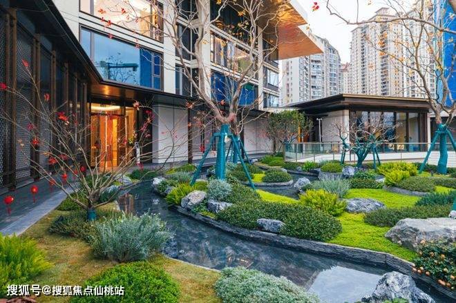 下沉景观庭院以“潘多拉透光奢石”打造的“瀑布”景墙,与山石、叠水相映成趣,勾勒出“烟柳画桥、东方雅韵”的诗意画面。以一座水榭戏台与4棵全冠移植的名贵黑松,勾勒出一幅“苔原溪谷,森系自然”的东方山水长卷。