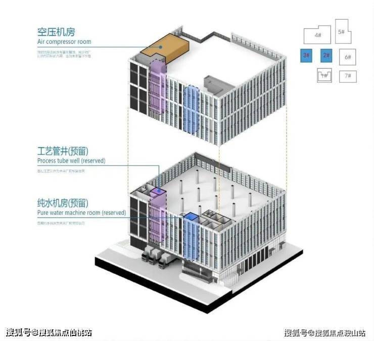 本项目设计两栋独栋厂房,满足生物医药对独门独户的要求。为满足企业的个性化需求,标准层预留空压机房、净水机房、工艺进排风管井和生产所需荷载。应对后期医药产业需求,充分预留相应配套的可能,如双回路系统、蒸汽系统、污水处理、危化品存储、公共实验室等重点产业配套均有相应的解决方案。