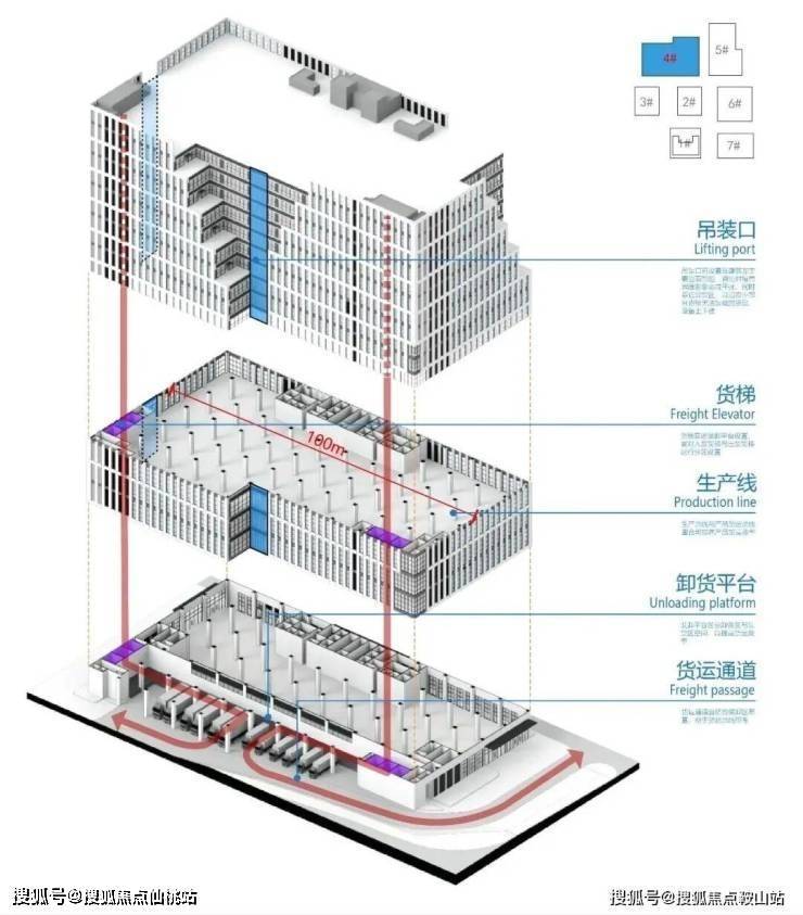 本项目共两栋7层的独栋厂房和三栋14层高层厂房,标准层面积设定在市场接受度较高的范围。独栋和高层厂房高荷载货梯、吊装口、卸货平台,楼层荷载承重能力及层高均按规范允许上限值以及市场调研的高标准值设置,首层层高增至8m、荷载提升至2T/㎡。高标准的设计可以满足绝大部分生产设备和生产线的布置。