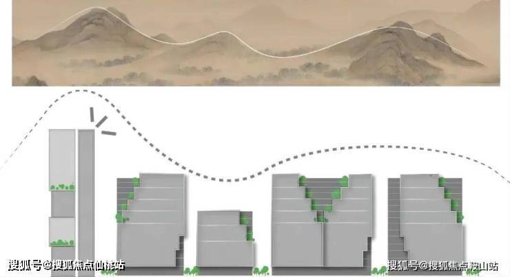 依托盐田独具特色的“山、海、城”格局,以“山形”元素演绎背山面海的自然禀赋,塑造别具特色的标志性城市界面;依山就势,整体融入梧桐山森林公园,绿意顺势铺开,形成“生态绿谷,山水融城”的空间格局,逐级提升的退台式城市院落,再次延展视线通廊。以沿海高速为界,背山面海,梧桐山向下蔓延,基地成为了梧桐山的一部分,取山为主题,“群山环绕,连山接海”。
