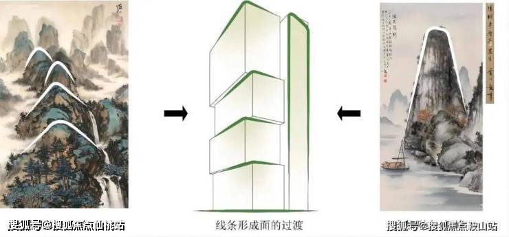 整体设计将山的意向贯穿于整个园区的立面设计之中,自然的延伸,取“山形”,做群山环绕。建筑与环境共同创造出新的场地关系。群山露高峰,取“高峰”,做转角塔楼。而转角的塔楼又是群山之首,为整个项目的点睛之笔。