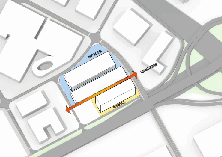 “一纵一横一核心”:一条横轴将园区分成北侧生产制造区和南侧生活配套区,一条纵轴将生产制造区和生活配套区紧密联系在一起。在纵横轴交汇处营造中央大花园,满足员工休闲、娱乐及运动需求的同时,消隐园区与城市的边界隔阂,更好地服务于社会。