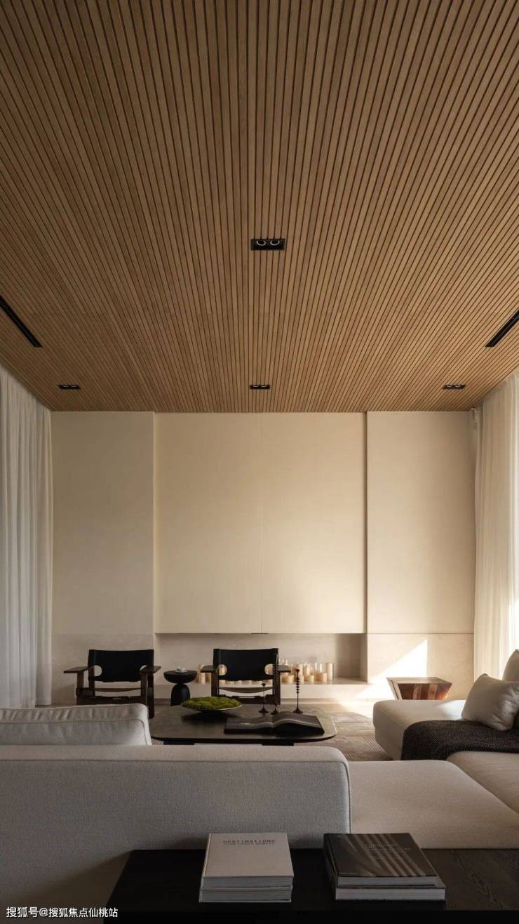 顶面线条简约的原木天花,衬托出矿泥自然质地涂刷的美感,原木与家私的配色由外而内引领视线,大面积的沙白色地面为整体结构注入一潭清泉。黑的静默、木的温润、白的清透,在肌理之中感受个性与和谐的氛围