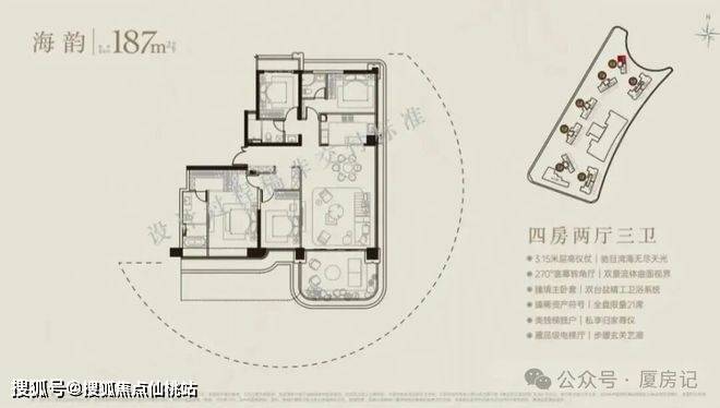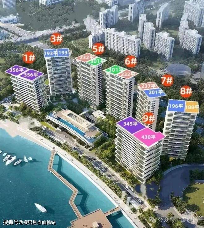 •主推建面约188-436㎡的四代私定大宅,户户带空中花园,综合使用率近100%,最大环幕视野达到270°;其中191㎡户型为四房两厅三卫,有端厅设计,奇数层客厅带露台,偶数层南向露台连接主卧与次卧;436㎡户型为五套间设计,三梯两户,每个房间都能瞰海;